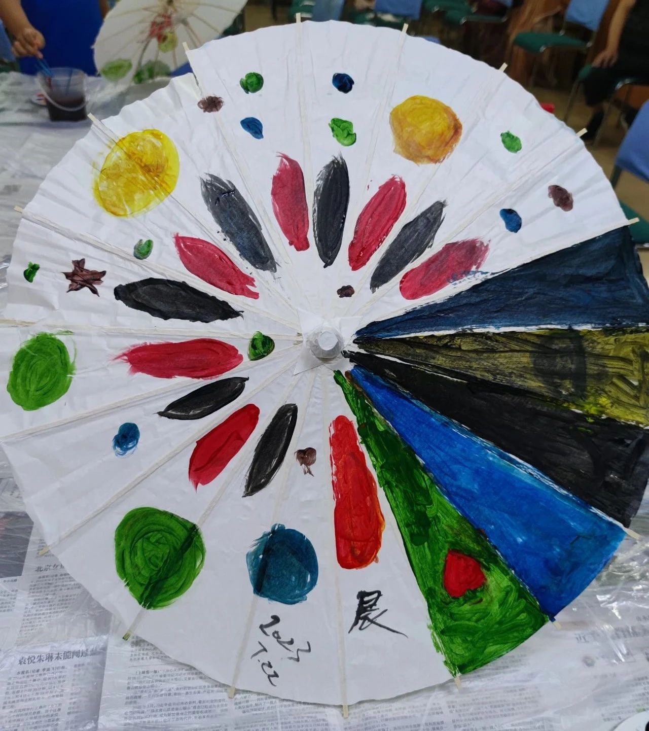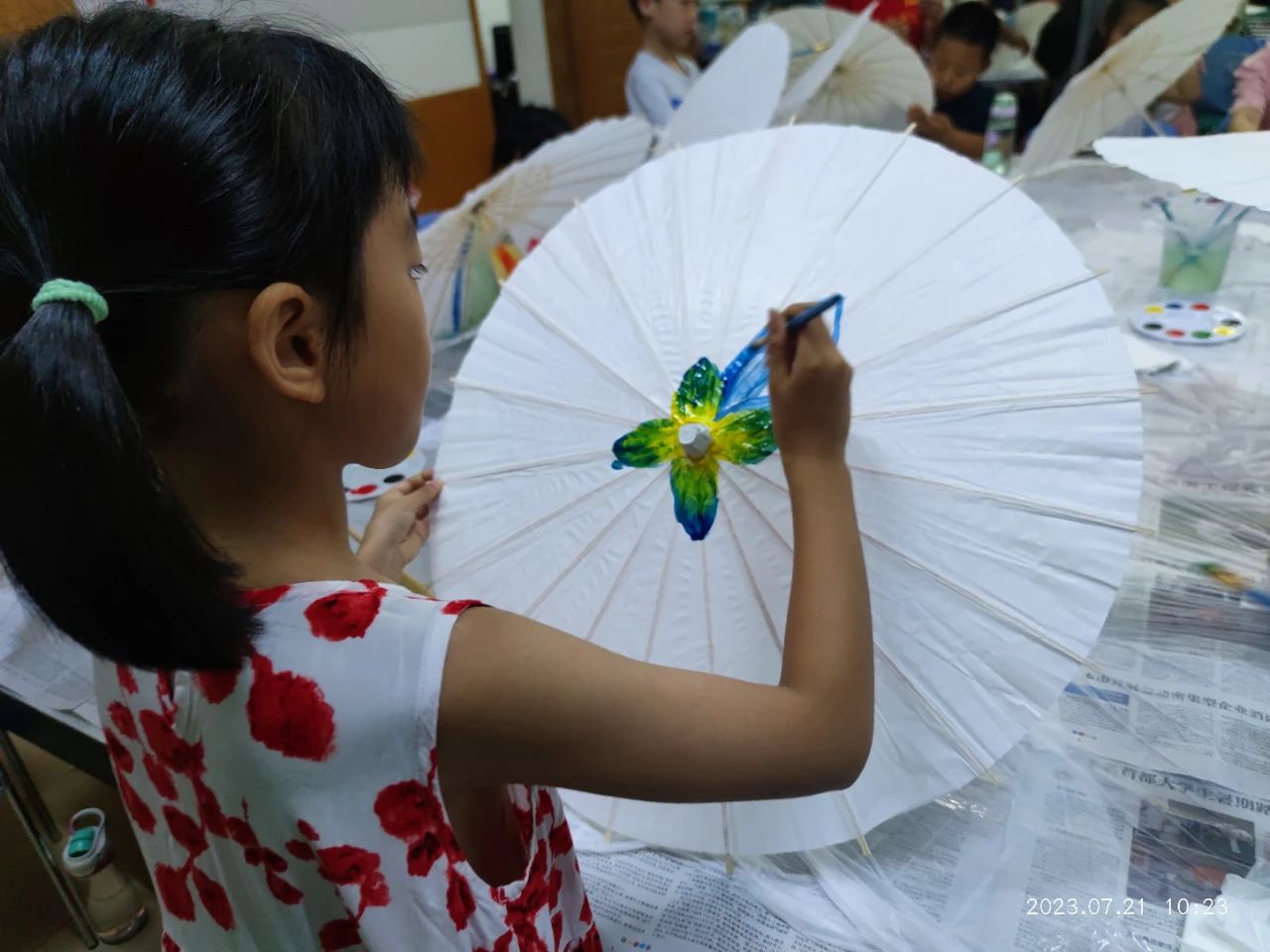 理论课程讲解之后,学生们展开了期待已久的动手绘制环节,助教老师们准备好绘制需要的空白纸伞、颜料、调色盘等工具,学生们根据自己的想法,在空白的纸上,画出了风格多样的伞面。