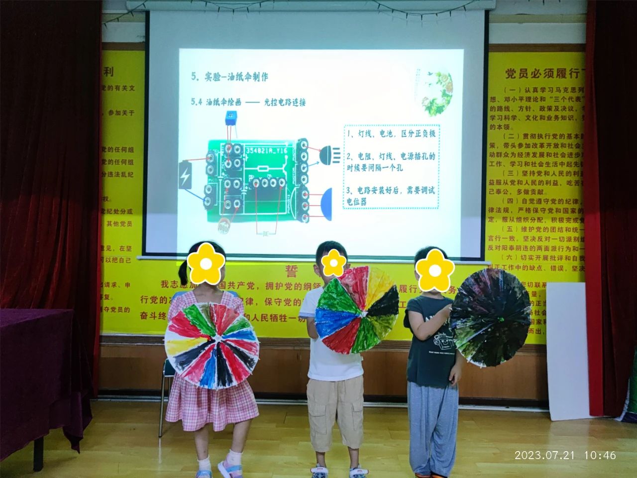 伞面绘制完成后,老师带领学生们,共同制作了“天黑即亮,天亮即灭”的感光功能电路灯,学生们非常惊讶的看着老师,并连连拍手感叹科技的神奇!