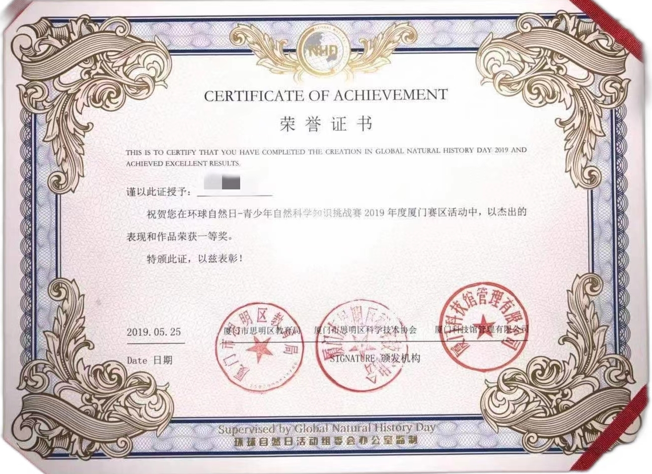学生荣誉:厦门市“自然科学知识挑战赛”一等奖