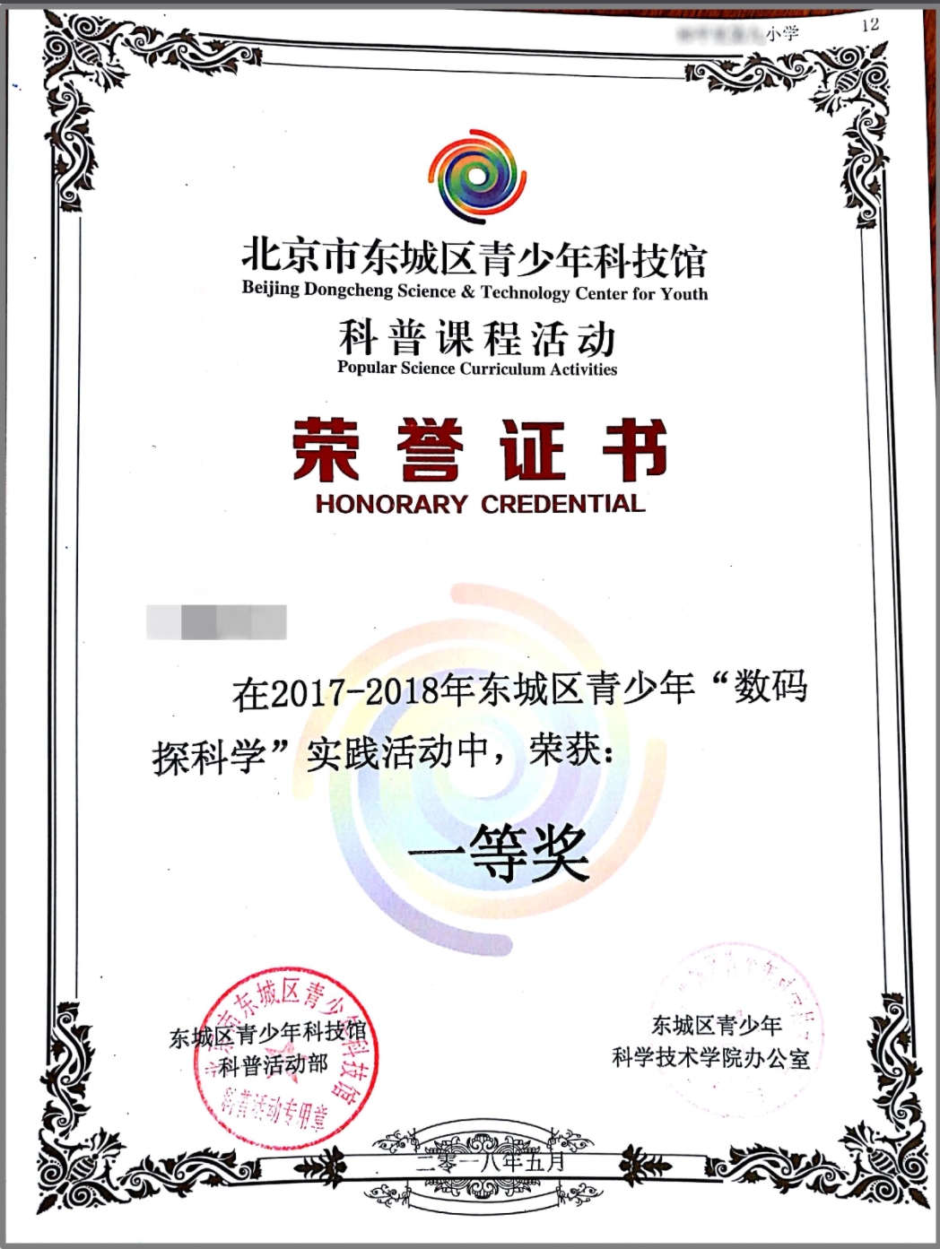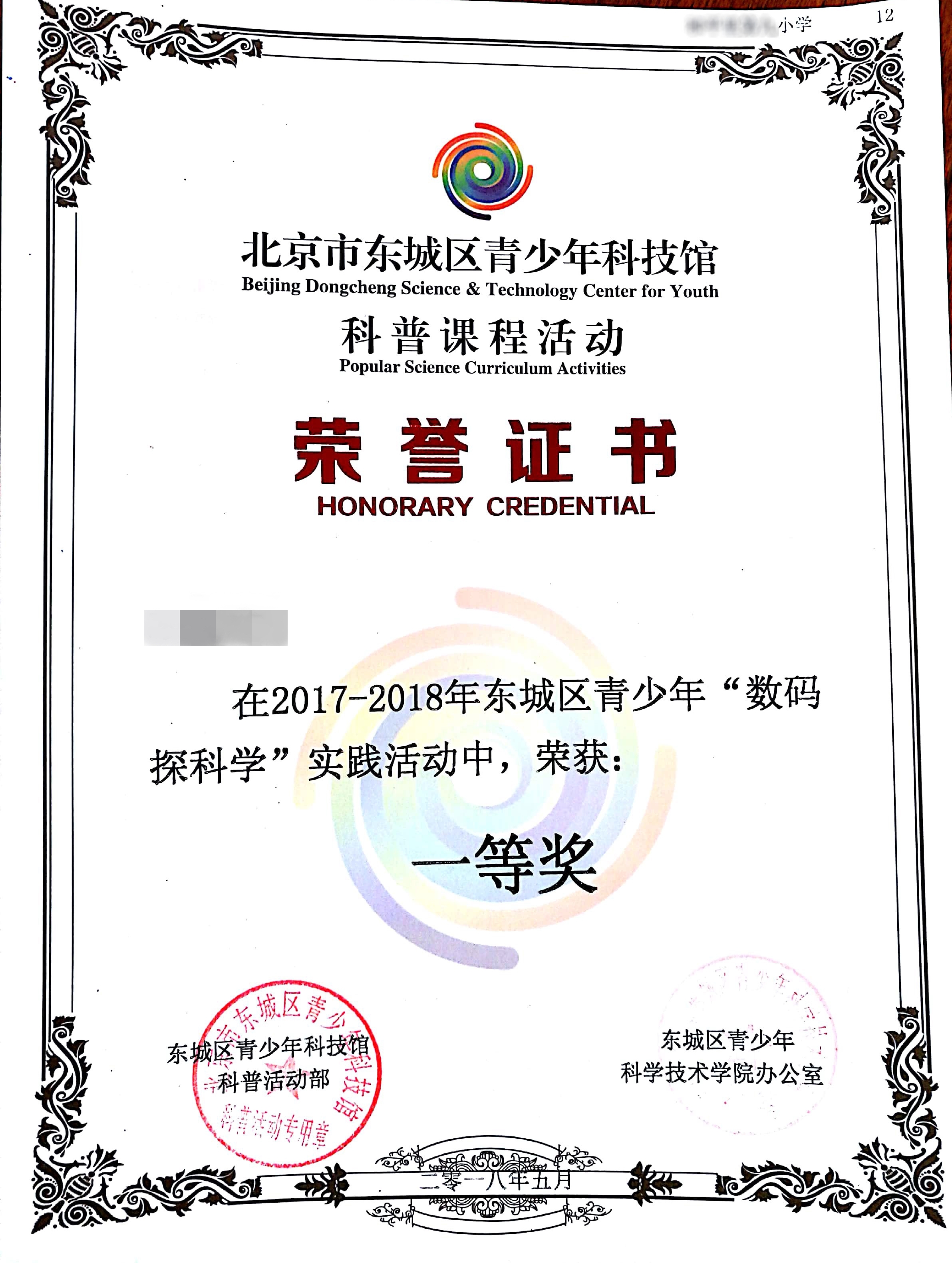 学生荣誉: 北京市东城区青少年“数码探科学”一等奖