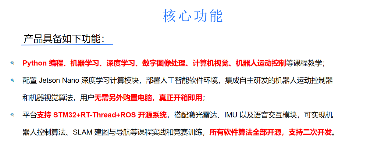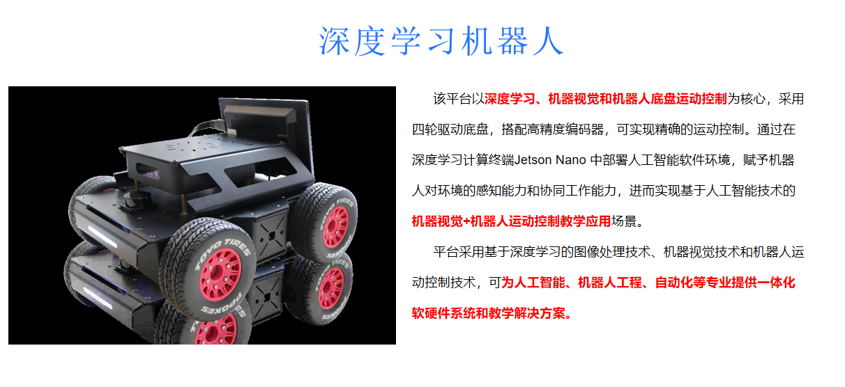 ​适用专业: 人工智能、机器人工程、自动化、电子、信息科学、机电等专业。 适用课程: Python 编程、机器学习、深度学习、数字图像处理、计算机视觉、机器人控制。