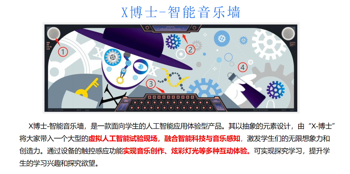 X博士-智能音乐墙,是一款面向学生的人工智能应用体验型产品。其以抽象的元素设计,由“X-博士”将大家带入一个大型的虚拟人工智能试验现场,融合智能科技与音乐感知,激发学生们的无限想象力和创造力。通过设备的触控感应功能实现音乐创作、炫彩灯光等多种互动体验。可实现探究学习,提升学生的学习兴趣和探究欲望。